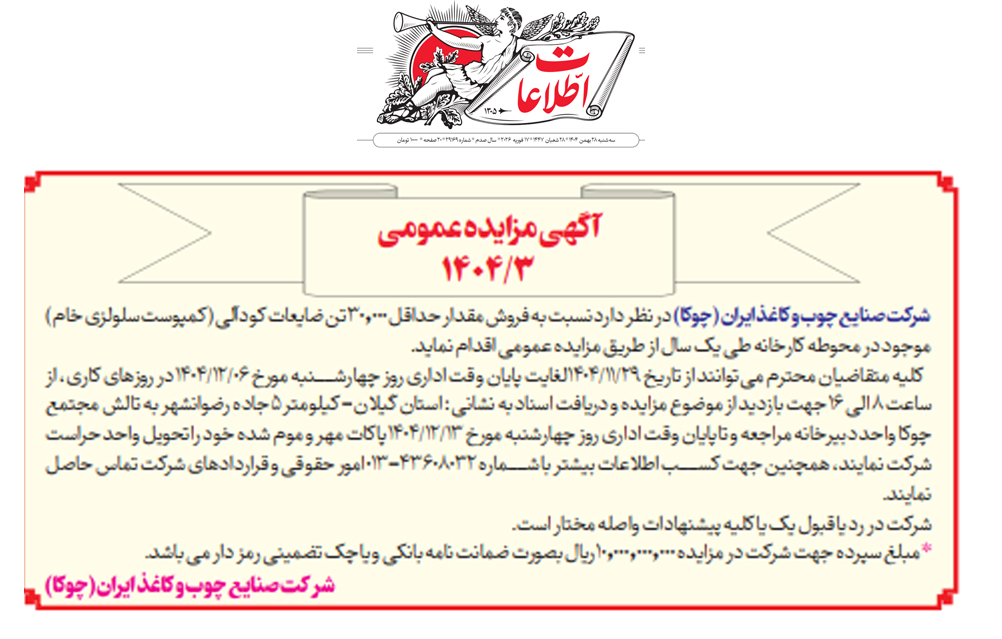 آگهي مزایده عمومی شماره 2/1404 شركت صنايع چوب و كاغذ ايران (چوكا) در نظر دارد نسبت به فروش اقلام بلا
